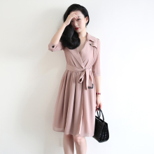 莫凝春秋季连衣裙女修身显瘦性感翻领系带七分袖风衣大摆裙A字裙