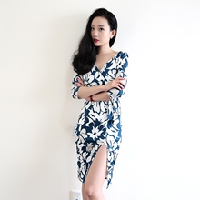 莫凝春夏季新款连衣裙女修身复古印花七分袖性感V领系带开叉中裙