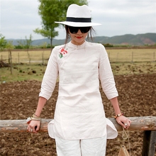 麻霖文艺棉麻女装2017夏季中式立领绣花盘扣七分袖亚麻上衣衬衫