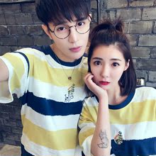 情侣装春夏新款潮流条纹半袖 男女小清新刺绣短袖t恤宽松韩版体恤