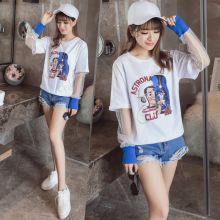 2017春夏新款韩版假两件网纱字母印花T恤女长袖学生宽松打底衫潮
