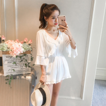 2017夏季新款荷叶边V领短袖棉麻连体裤女小清新收腰阔腿裤连衣裤