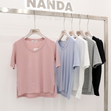 Haose号色 净色百搭 桃心V领简约小宽松下摆开衩短袖女T恤 棉质te