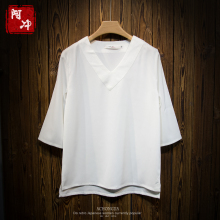 阿冲 春季新款中长款雪纺衫韩版雪纺短袖V领打底衬衣宽松大码女装