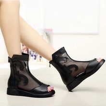2017新款女鞋真皮黑色凉鞋女罗马网纱鱼嘴鞋休闲平底时尚女士凉靴