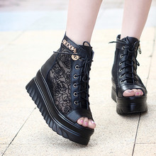 2017春夏新款女凉鞋坡跟网纱罗马真皮鱼嘴鞋厚底松糕鞋防水台凉鞋