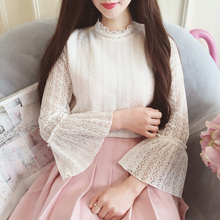 17春季新款立领7分喇叭袖白色镂空蕾丝套头衫女装小清新气质上衣