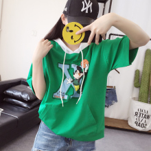 2017夏季新款带帽短袖t恤女宽松韩版学生卡通印花半袖拼色t恤女