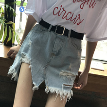 复古BF原宿风韩版手工撕破毛边女裙高腰浅蓝破洞牛仔裙显瘦夏#K86