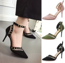 春季女新款韩版铆钉网纱浅口中空尖头一字扣单鞋高跟鞋夜店时装鞋