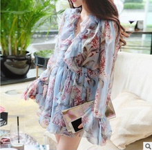 2017新款春夏长袖雪纺V领高档气质花色短款大摆连衣裙女装裤裙