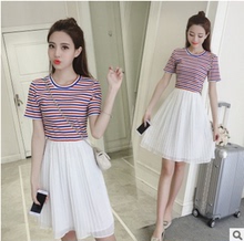 2017新款夏装韩版中长款短袖条纹雪纺拼接百褶连衣裙女小清新