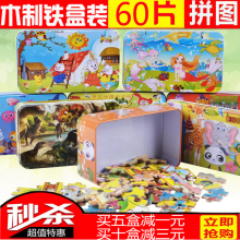 铁盒60片木质拼图幼儿童宝宝早教益智力2-3-4-56岁男女孩积木玩具