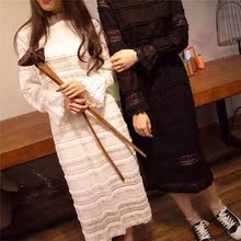 2016春装新款 韩版女装花边立领中长款蕾丝连衣裙气质修身打底裙