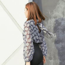 2017春装新款女装气质宽松褶皱印花雪纺衫长袖打底衫潮