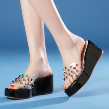 2016新款欧美透明厚底凉拖鞋女夏真皮松糕水钻铆钉坡跟中跟凉鞋子