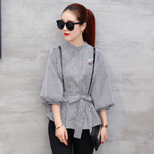 2017春季新款修身显瘦条纹立领系腰带灯笼袖衬衫女长袖衬衣春款潮