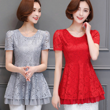 韩版女装2017新款蕾丝衫新款大码短袖裙摆上衣中长款T恤打底衫潮
