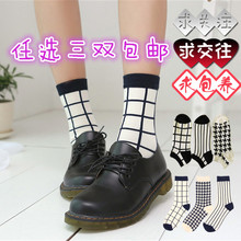 日系千鸟格袜子女士全棉黑白条纹百搭中筒袜个性潮流女袜复古短袜