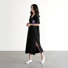 夏季新款韩版大码莫代尔长款连衣裙V领短袖宽松开叉插兜休闲长裙