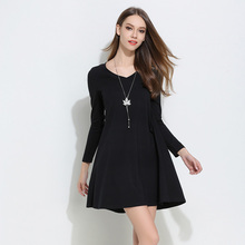欧洲站春装2017新款纯棉高领小黑裙中长款宽松大码女装长袖连衣裙