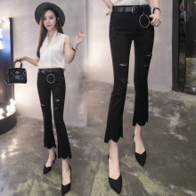 春季新款韩版破洞高腰喇叭裤九分裤女弹力显瘦毛边流苏黑色微喇裤