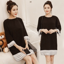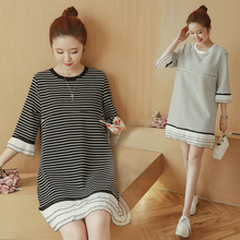2017孕妇装春装上衣新款韩版大码孕妇条纹七分袖中长款孕妇连衣裙