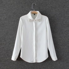 外贸原单女装 修身显瘦OL领口镶钻白色长袖衬衫衬衣
