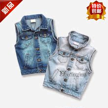 包邮男女中大童纯棉马夹背心 春秋季儿童磨白牛仔马甲外套海蓝蓝