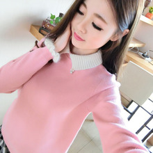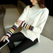 2016冬季新款 长袖袖口条纹下摆开衩加厚套头针织毛衣 女打底衫