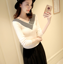 2017春装新款女装 韩V领海军风修身显瘦弹力露肩针织衫打底毛衣女