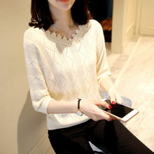 2017春夏新款 修身薄款V领花边7分袖纯色针织衫毛衣外套女 打底衫