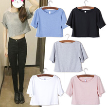 欧美棉质百搭纯色短款露脐高腰宽松T恤短袖上衣女夏季新款 潮