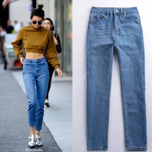 欧美风金小妹同款复古高腰修身百搭蓝色牛仔裤长裤女哈伦裤潮