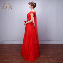 2017春季新款大红色礼服晚会一字肩V领结婚敬酒服宴会晚礼服夏季