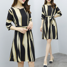2017夏季新款韩版条纹印花雪纺连衣裙女中长款宽松系腰带A字裙潮