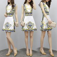 2017夏装韩版女士圆领拼接无袖印花修身显瘦连衣裙
