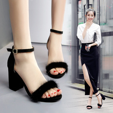 2017夏季新款女鞋黑色真皮性感明星同款一字扣带高跟鞋粗跟凉鞋