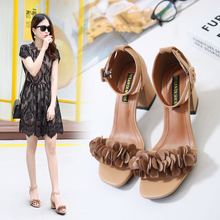 2017夏季新款韩版方头高跟罗马女鞋一字扣带露趾粗跟花朵凉鞋女夏
