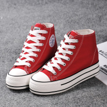 人本春新款女式高帮帆布鞋松糕底内增高潮纯色布鞋时尚大红休闲鞋