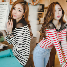 2017春装女装条纹t恤女新款网纱性感修身长袖紧身打底衫小衫女潮