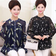 中年女士春秋小衫短款上衣妈妈装长袖雪纺体恤绣花中老年中袖衬衣