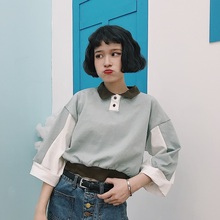 春夏女装新款韩版原宿风拼色短款卫衣POLO领宽松中袖学生T恤上衣