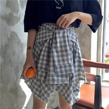 春夏女装新款韩版学院风不规则裙摆假两件格子半身裙高腰学生中裙