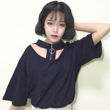 春夏女装韩版原宿风个性圆环拉链短袖T恤纯色镂空POLO衫宽松上衣