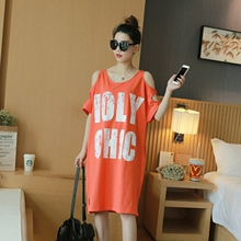 2017新品夏装韩版字母印花大码宽松镂空露肩中长款短袖t恤衫女潮