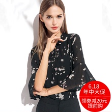 2017春装新款女装长袖雪纺衫显瘦时尚百搭上衣黑色印花喇叭袖潮
