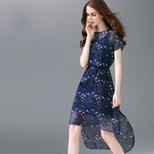 开叉不规则前短后长中长款印花雪纺碎花连衣裙收腰显瘦两件套