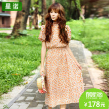 星诺2017春夏季新款中长裙 复古文艺森女系印花英伦风雪纺连衣裙