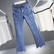 2017新款春季韩版做旧浅蓝色高腰紧身弹力显瘦九分喇叭裤牛仔裤女